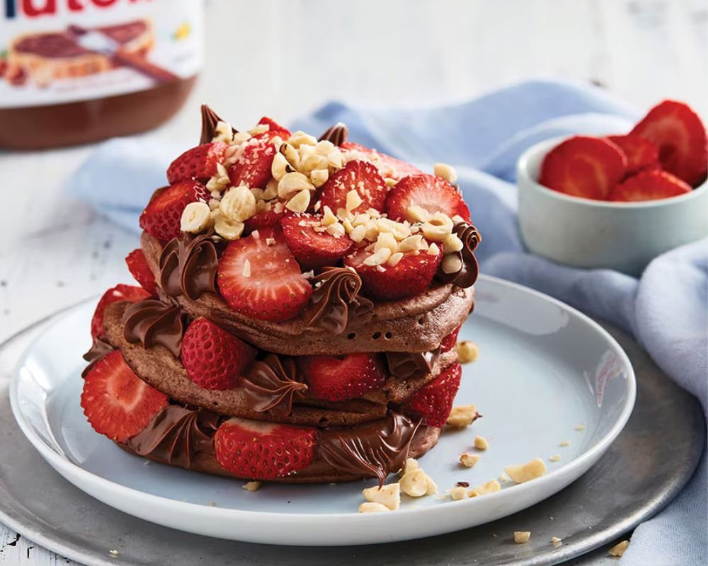 pancakes, keeping any finished pancakes warm in the oven. - To serve, layer the pancakes with piped Nutella and sliced strawberries. Then, top with the chopped
