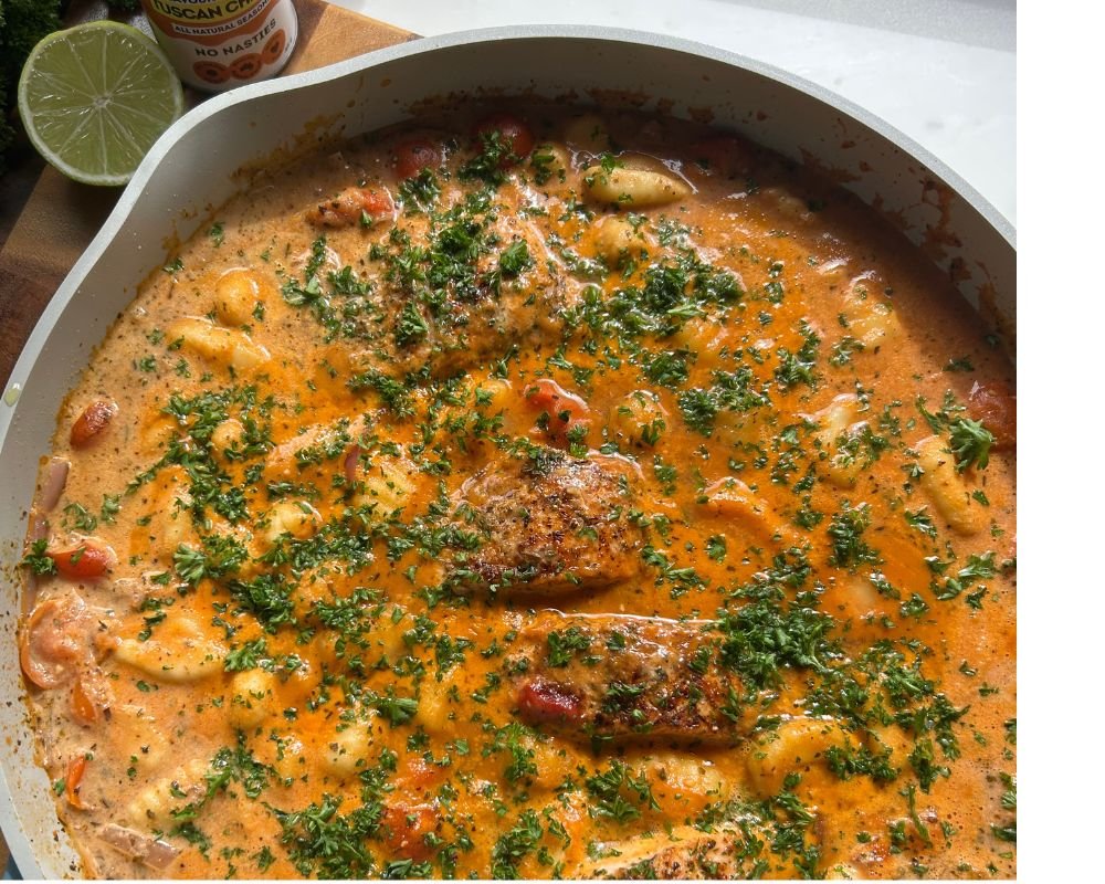 Creamy, comforting, and just a little bit fancy – this Tuscan Salmon Gnocchi is proof that when it comes to a quick mid-week dinner, Spaghetti Bolognese is not the only pasta option. Instead, this fluffy gnocchi swimming in a luscious tomato and cream sauce, kissed with Tuscan herbs, juicy Roma tomatoes, and tender salmon that flakes perfectly with every forkful, makes an excellent alternative.